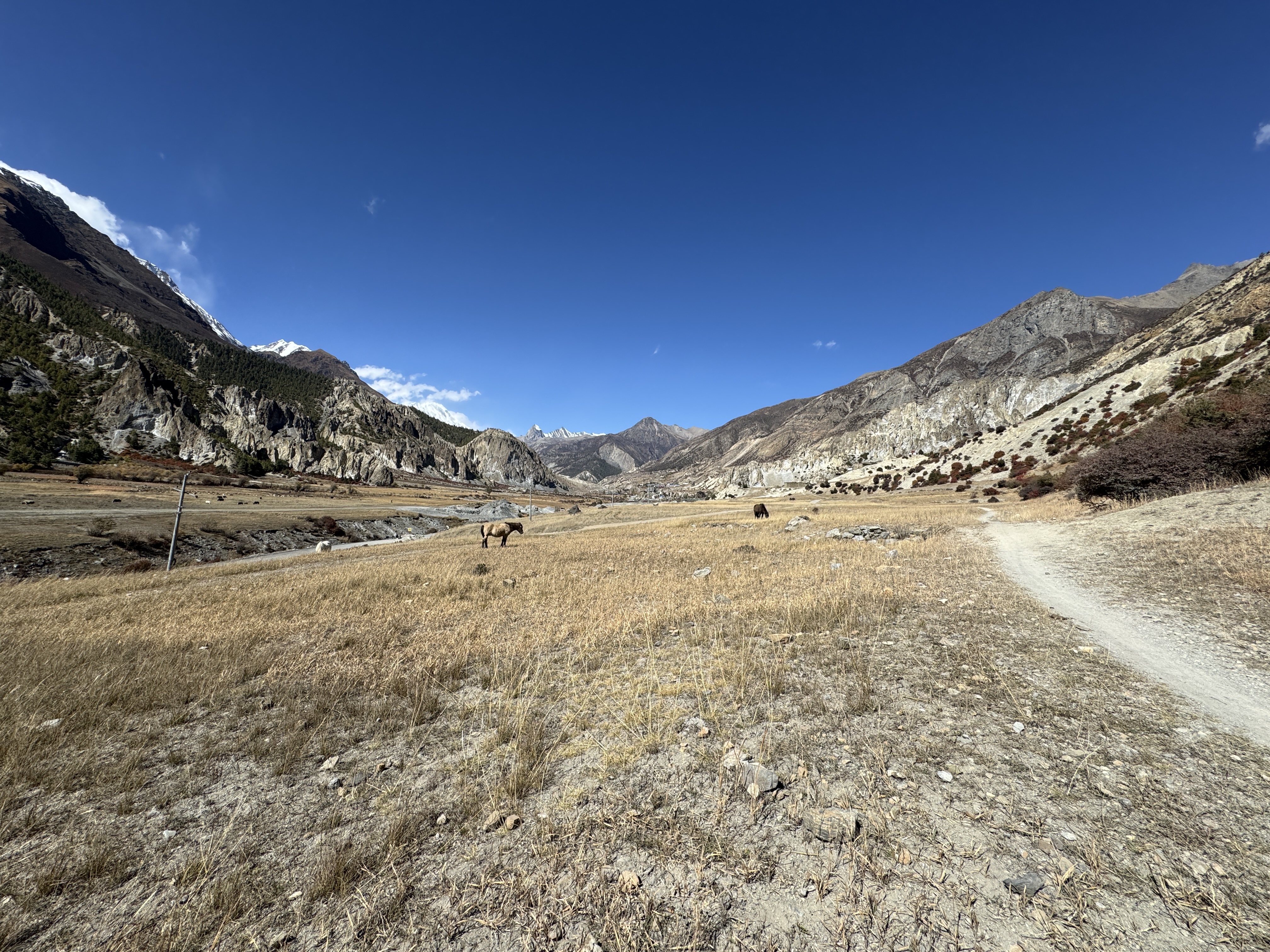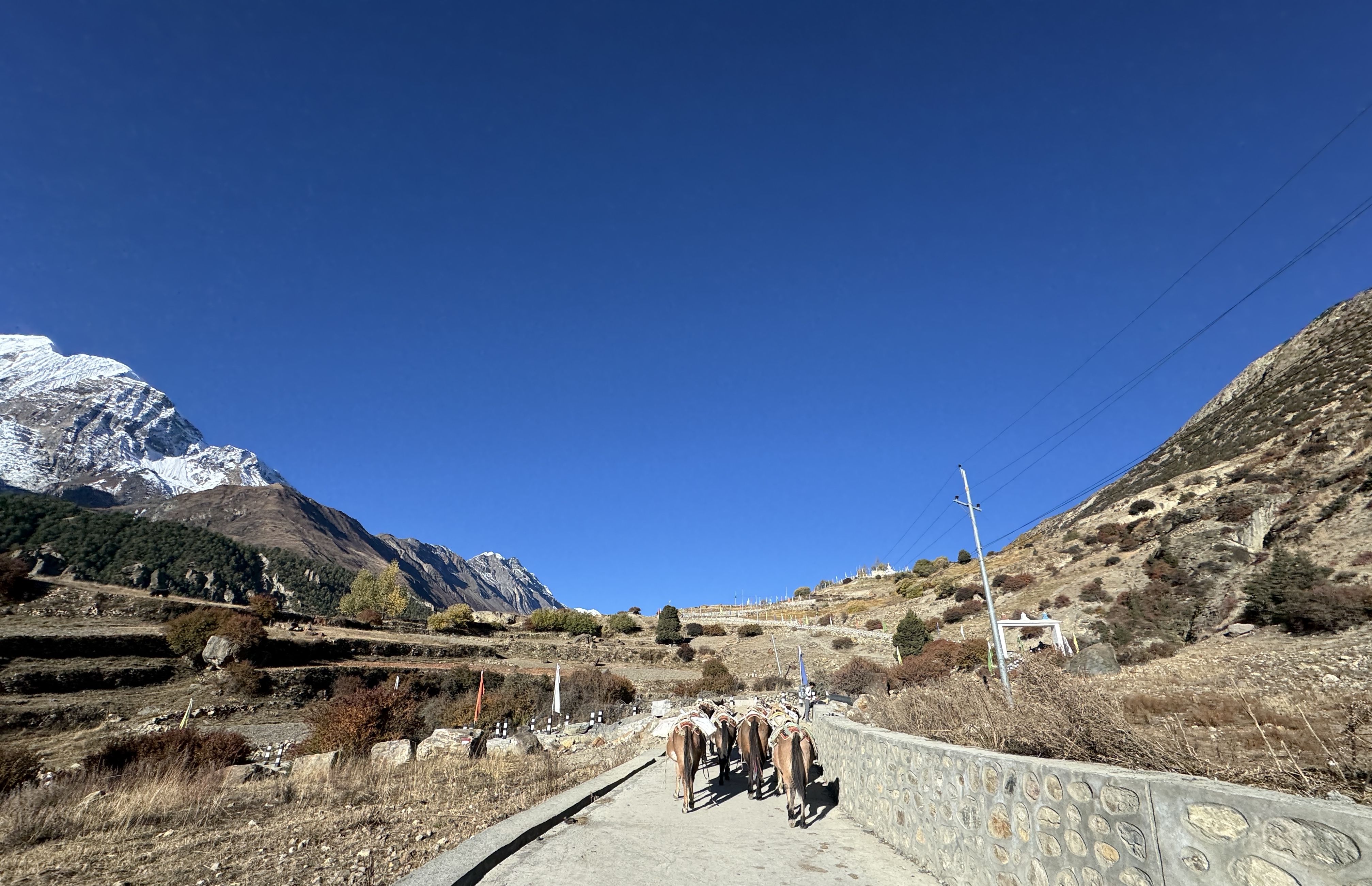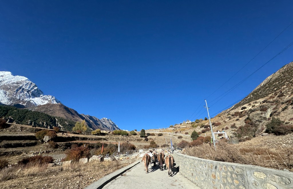 À Kathmandu, les motos et voitures nous fonçaient dessus, ici ce sont les chevaux et les mules.