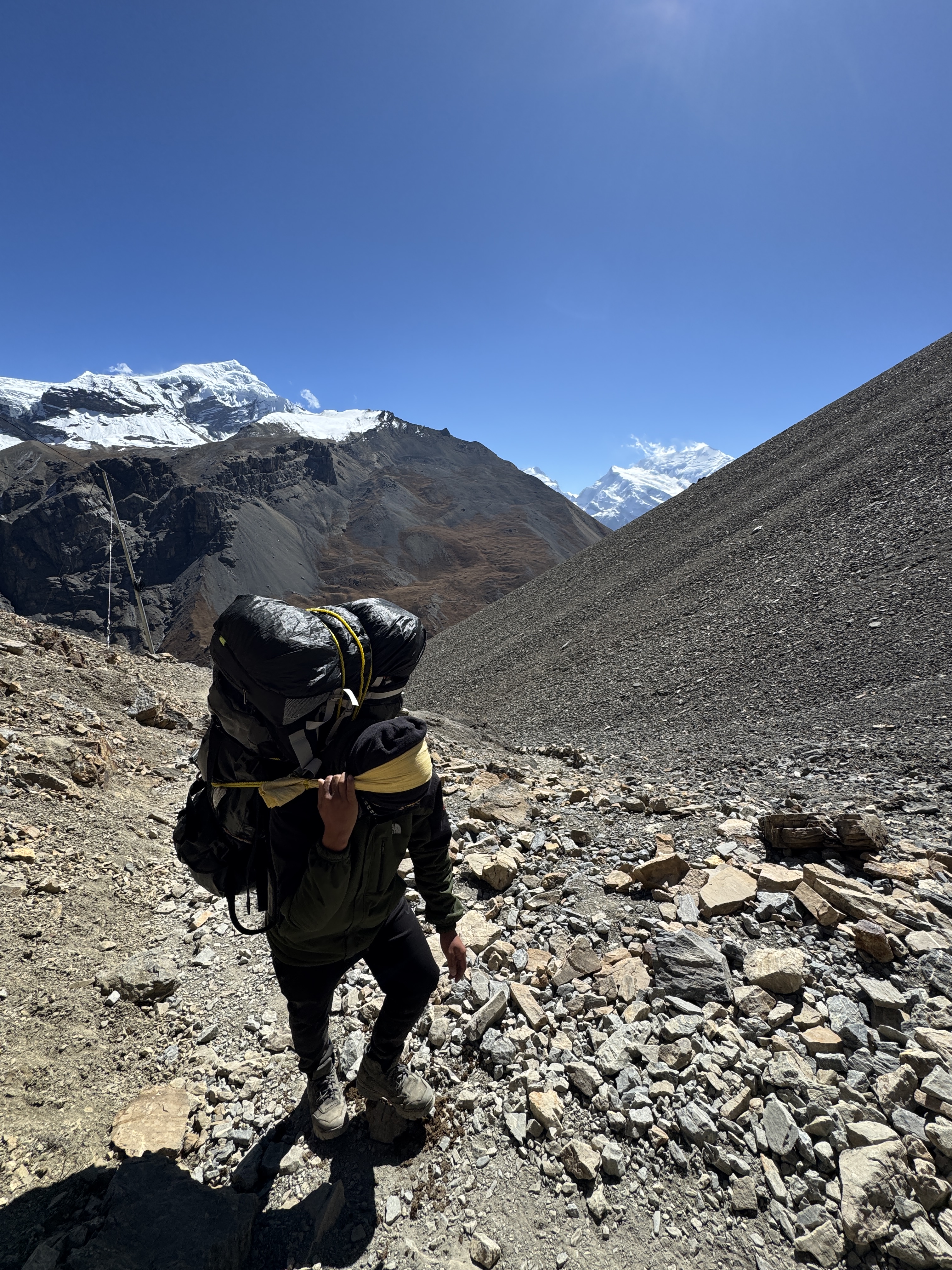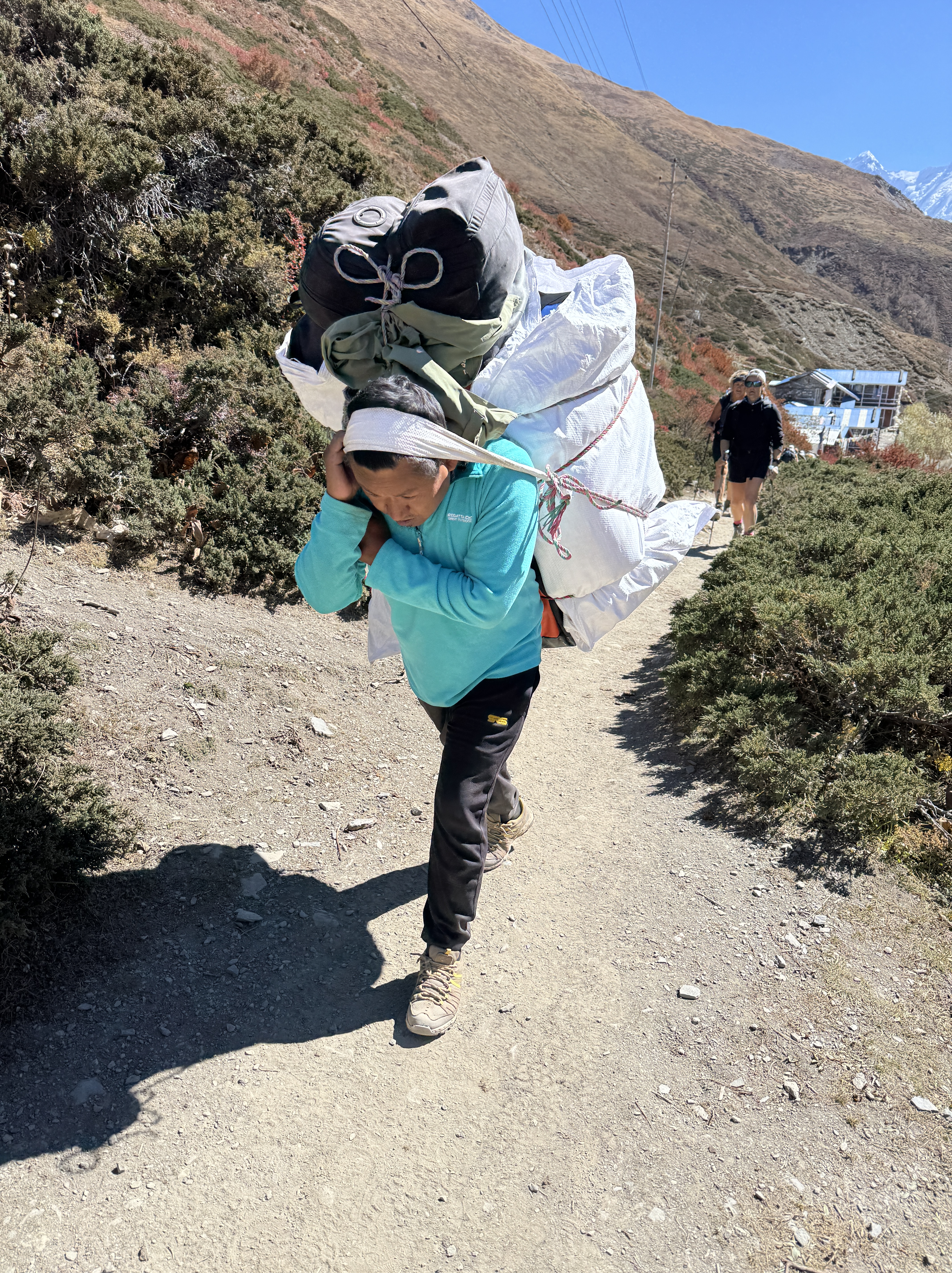 On finalise nos sacs de marche tandis que nos porteurs préparent leur cargaison. 20kg chacun + leur sac. Heureusement qu’ils optimisent mieux leur bagage personnel que nous…
