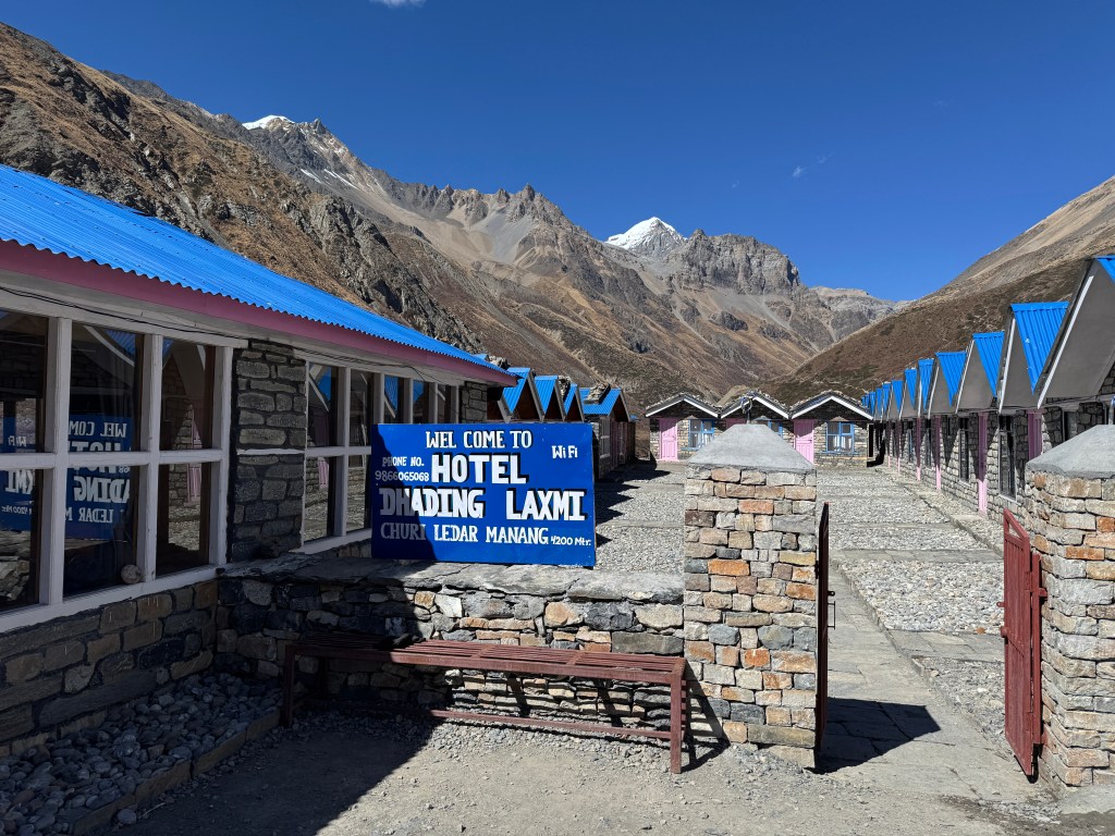 Nous, nous mettons effectivement une quarantaine de minutes pour rejoindre le Thorong Base Camp à 4 540m, le New Hill Top Restaurant plus précisément pour une pause boissons, recharge en eau et préparation pour l’ascension. Je discute avec un trailer madrilène qui s’apprête à prendre le départ pour le High Camp, nos chemins se recroiseront.