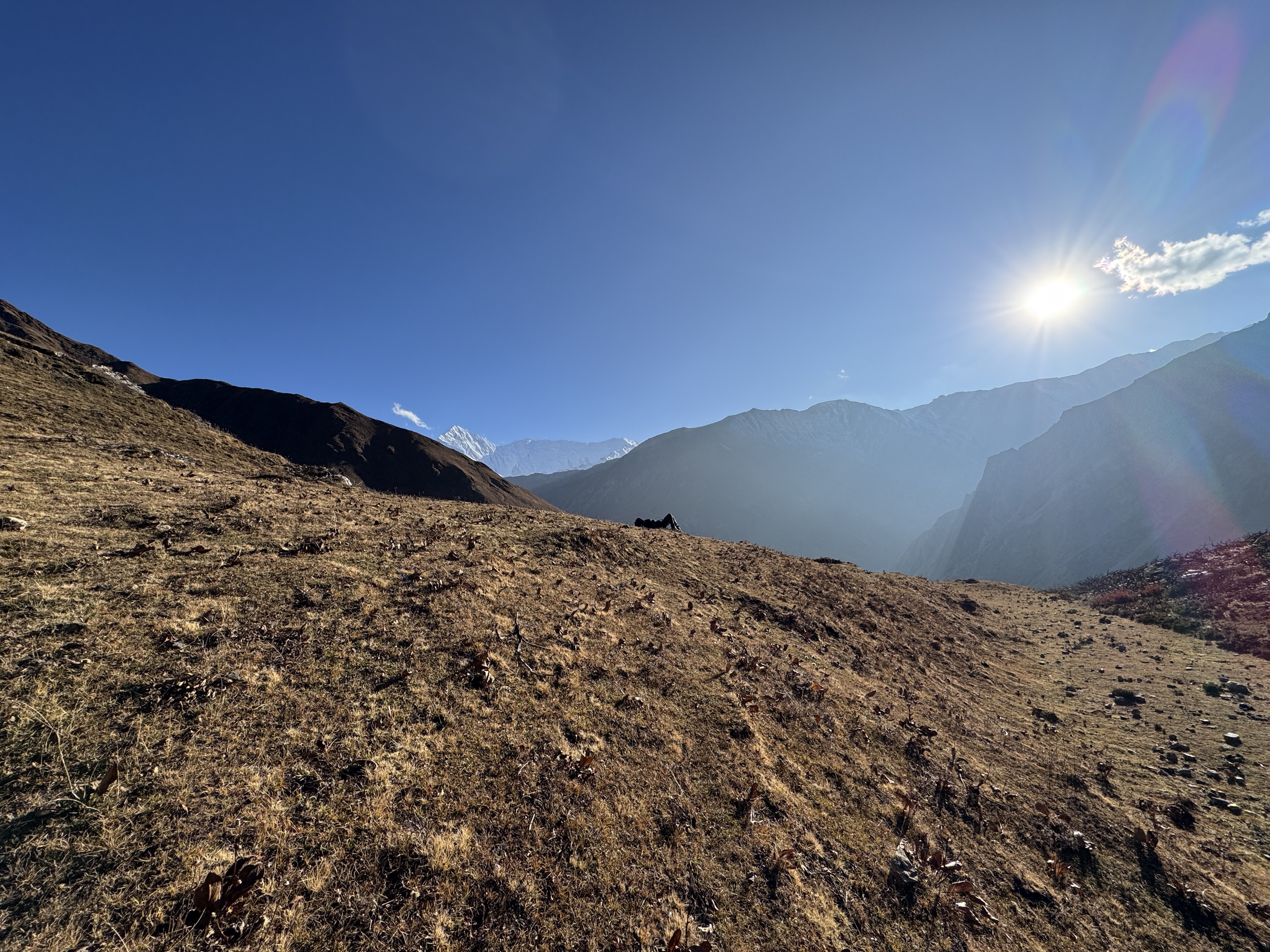 45’ plus tard, on fait une pause. Dilli profite qu’on soit à 3 800m et des poussières pour nous acclimater.
