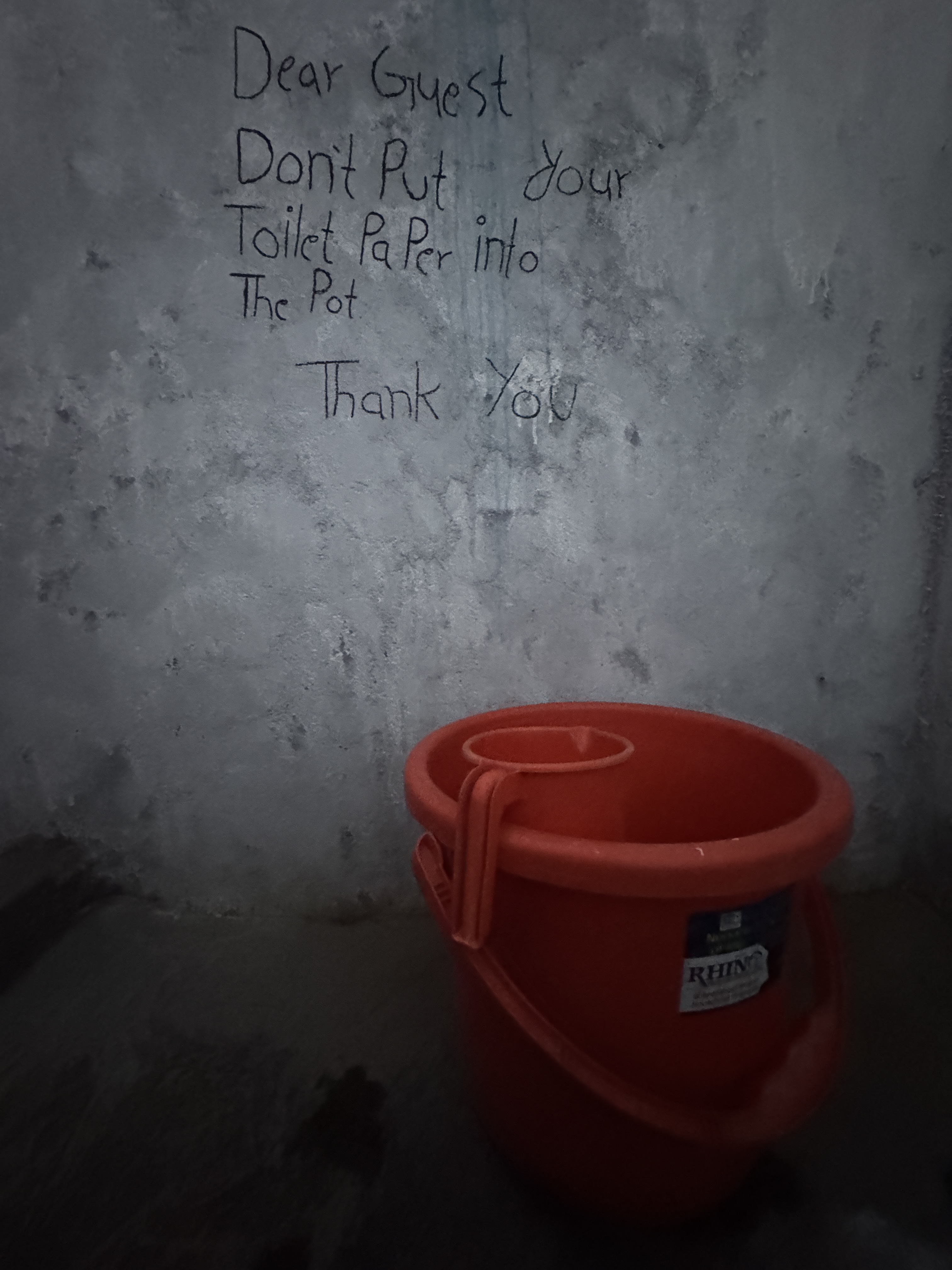 On y découvre des tablettes tout autour des lits ET une table de nuit pour poser nos affaires. Les toilettes comptent des porte manteau et la poubelle à papier toilette a un couvercle. « Le grand luxe » comme dirait Corinne ! Bon, par contre, la fenêtre n’a encore pas de vitre, ils aiment quand ça ventile froid les Népalais.