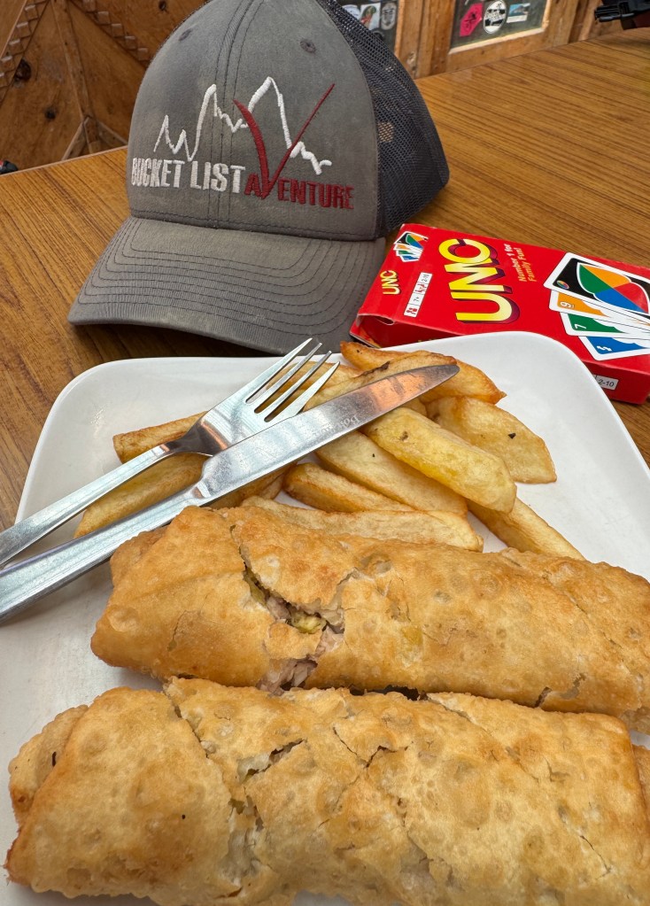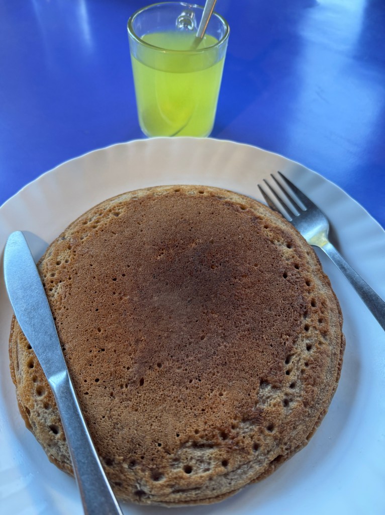 Le pancake n’est pas exceptionnel, un peu étouffe chrétien et froid mais pas gras du tout. Ça fera l’affaire pour donner de l’énergie avec le froid qui va cramer de la calorie.