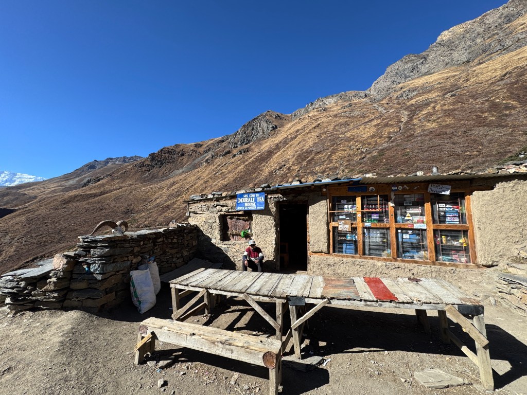 Au bout d’une heure, je tombe enfin les 2 premières couches (il m’en reste 3). La pause se déroule au Deurali Tea House.
