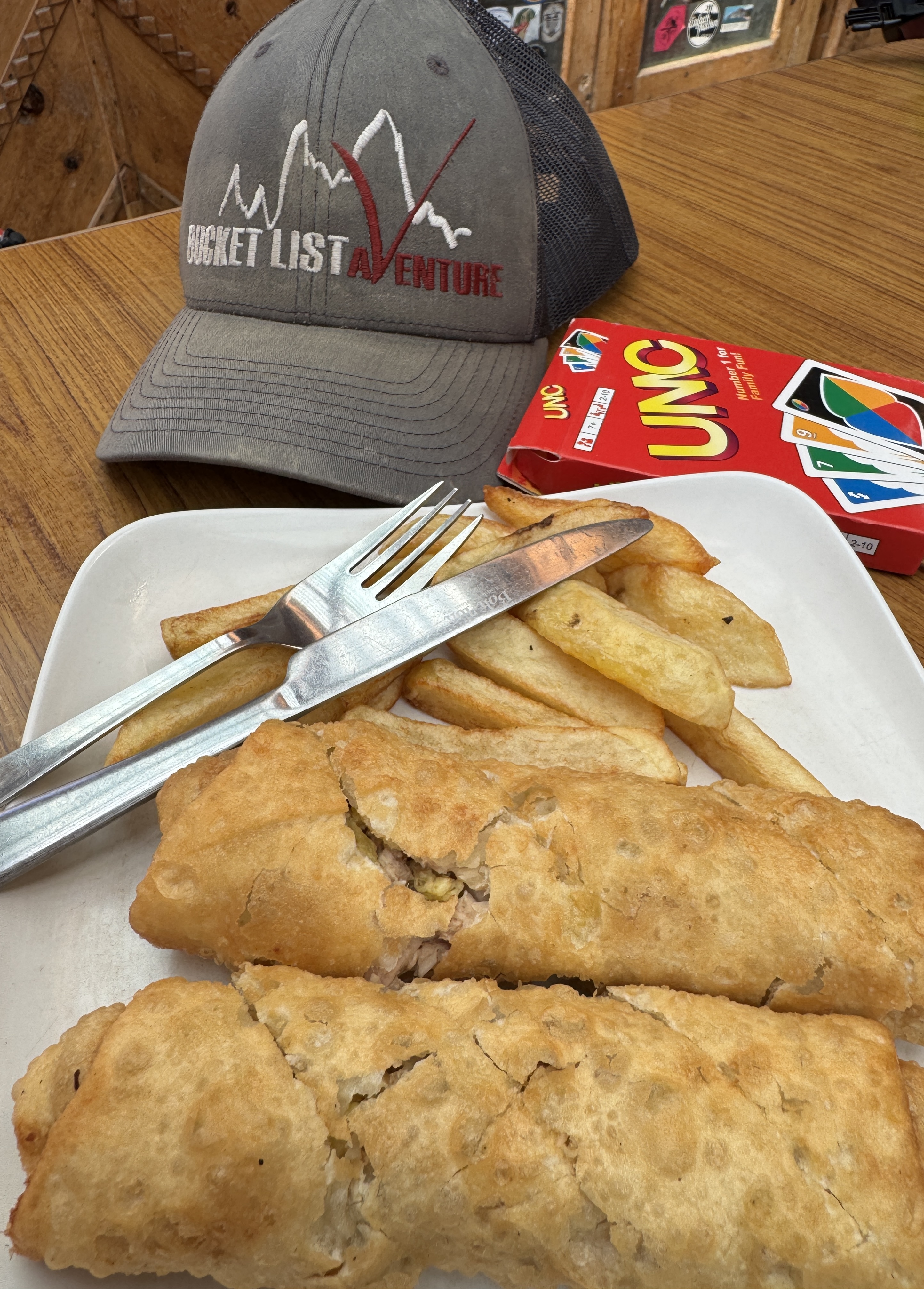 En attendant nos assiettes, on joue au Uno dans la salle commune.