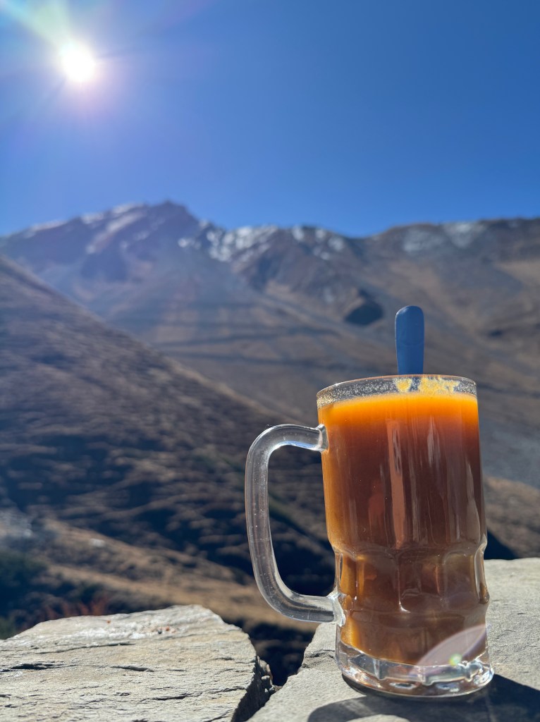 Rapidement, notre soupe à l’ail est servie. Elle est censée avoir des vertus pour l’altitude. À suivre…