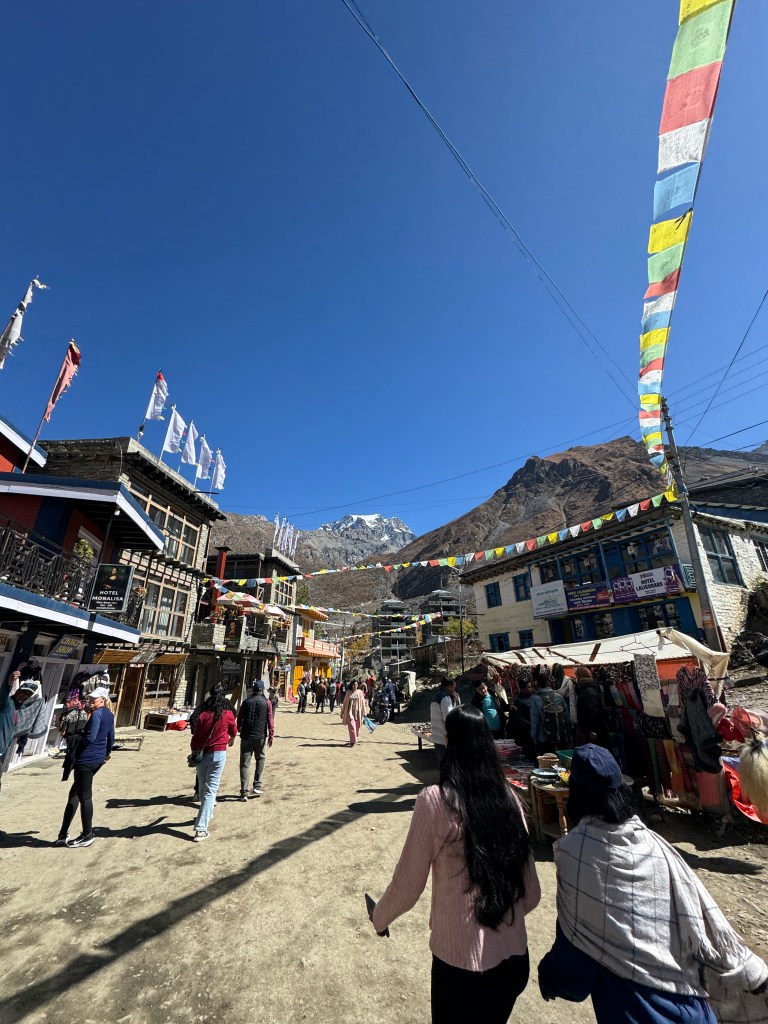 En revanche, quand nous arrivons à Muktinath, un lieu de pèlerinage bouddhiste et hindouiste, c’est le choc ! Le retour à la civilisation est brutale avec du monde partout, normal, le temple de la ville est un peu l’équivalent de notre Lourdes et 500 pèlerins s’y pressent chaque jour.