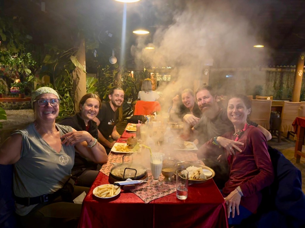 Avec mes deux amis rescapés, on se retrouve à 17h autour d’un thé au restaurant de l’hôtel. Et on refait le monde. On enchaîne avec un délicieux mixed fruit Lassi, des veggie momo pour moi et des pizzas pour eux. Céline se laisser tenter par un dessert, une crêpe bananes qui arrive en deux exemplaires, j’ai le plaisir d’en goûter un morceau, c’est divin !