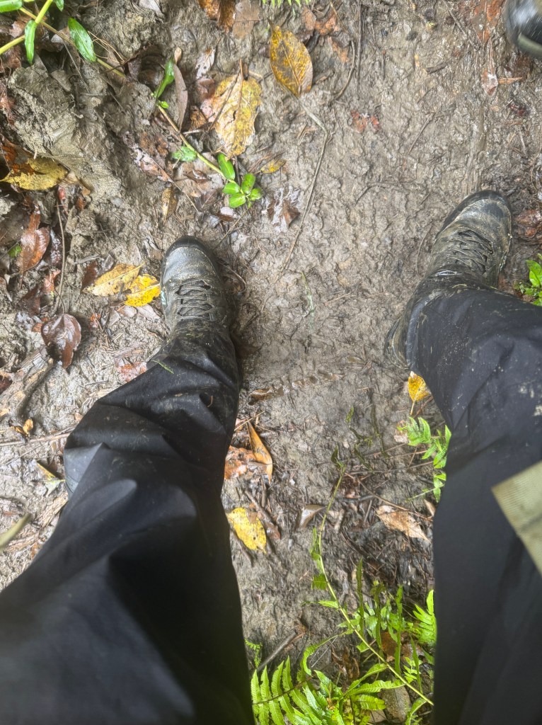 On s’équipe en couleurs qu’il faut et petit détail : chaussettes sur pantalon pour éviter les sangsues, ça promet !