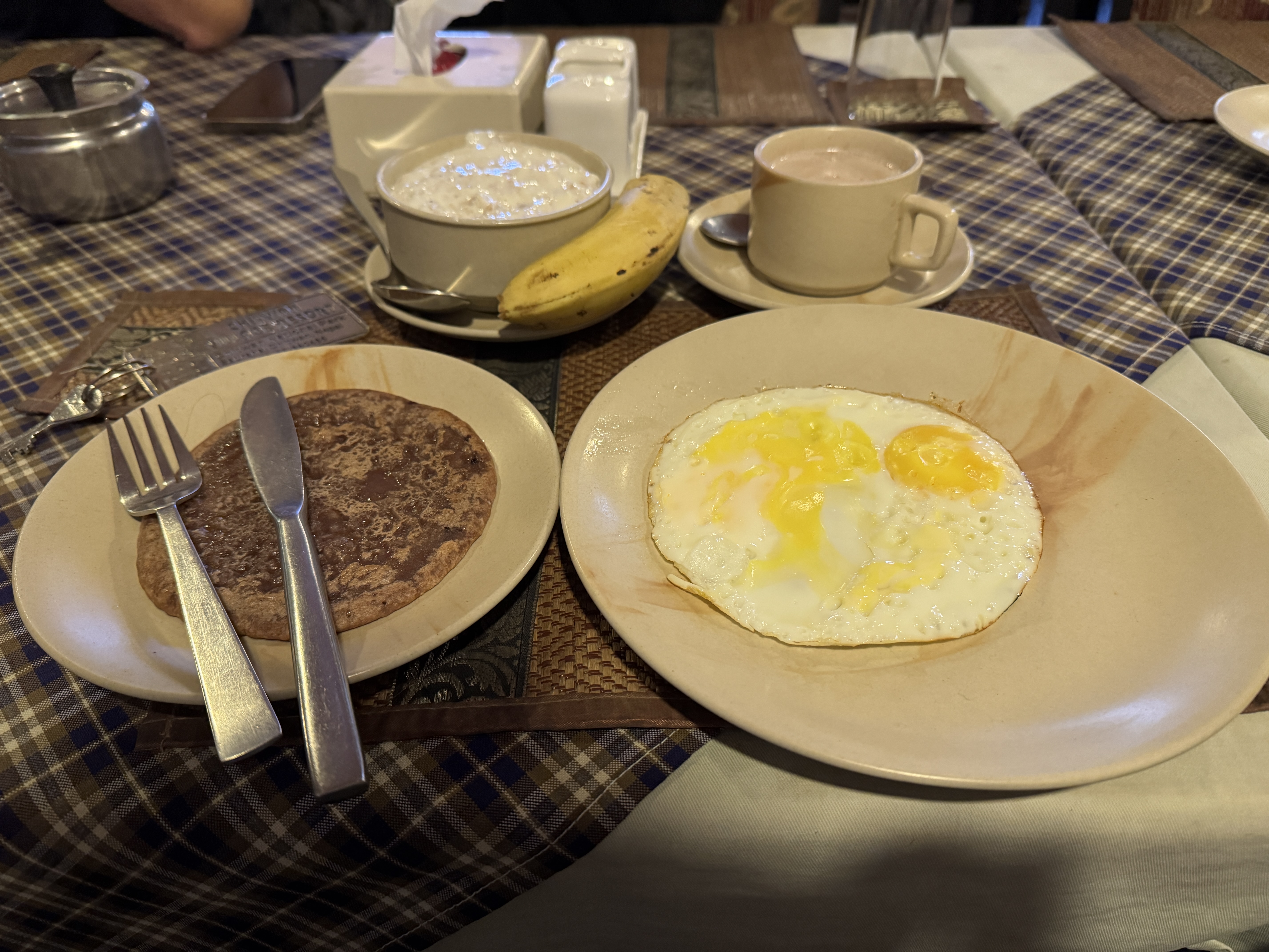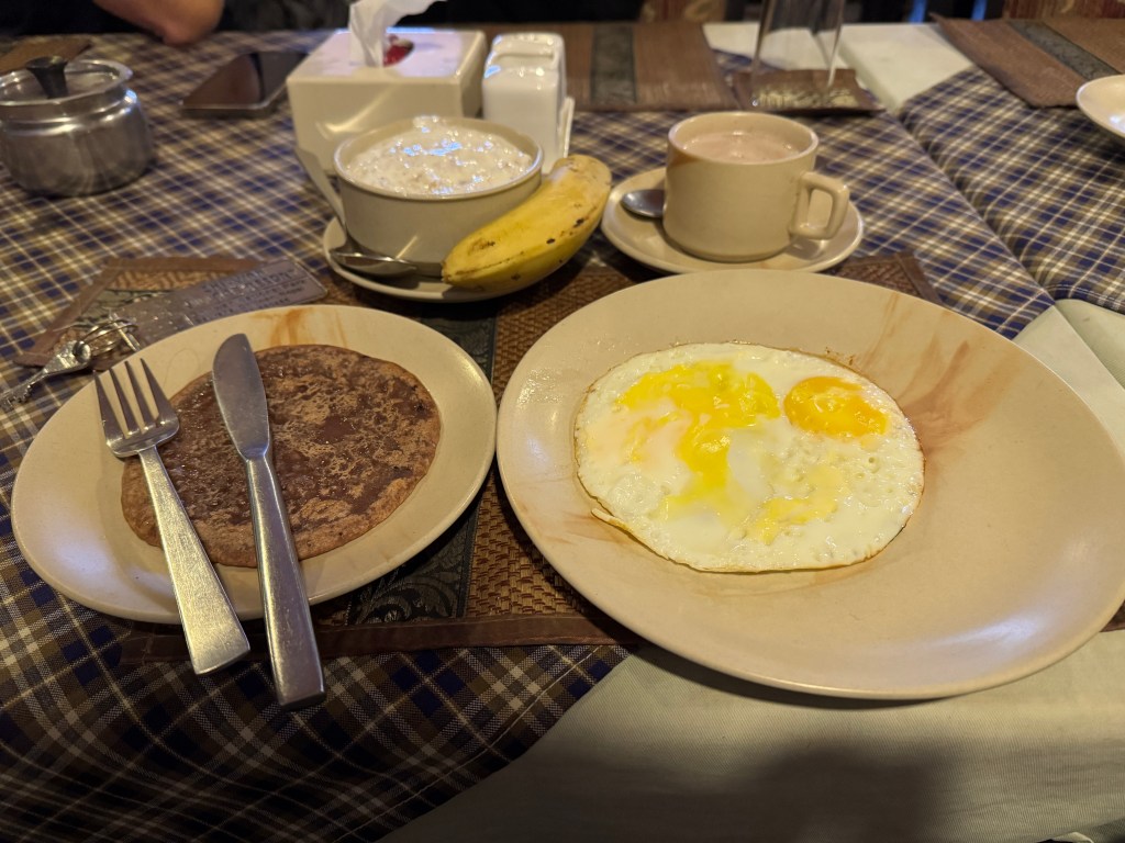 La nuit n’a pas été des plus sereines et je ne sais pas pourquoi ! En tout cas, à 5h50, je suis debout ! Ce qui me laisse du temps pour bien boucler mes sacs et savourer mon dernier petit-déjeuner népalais.