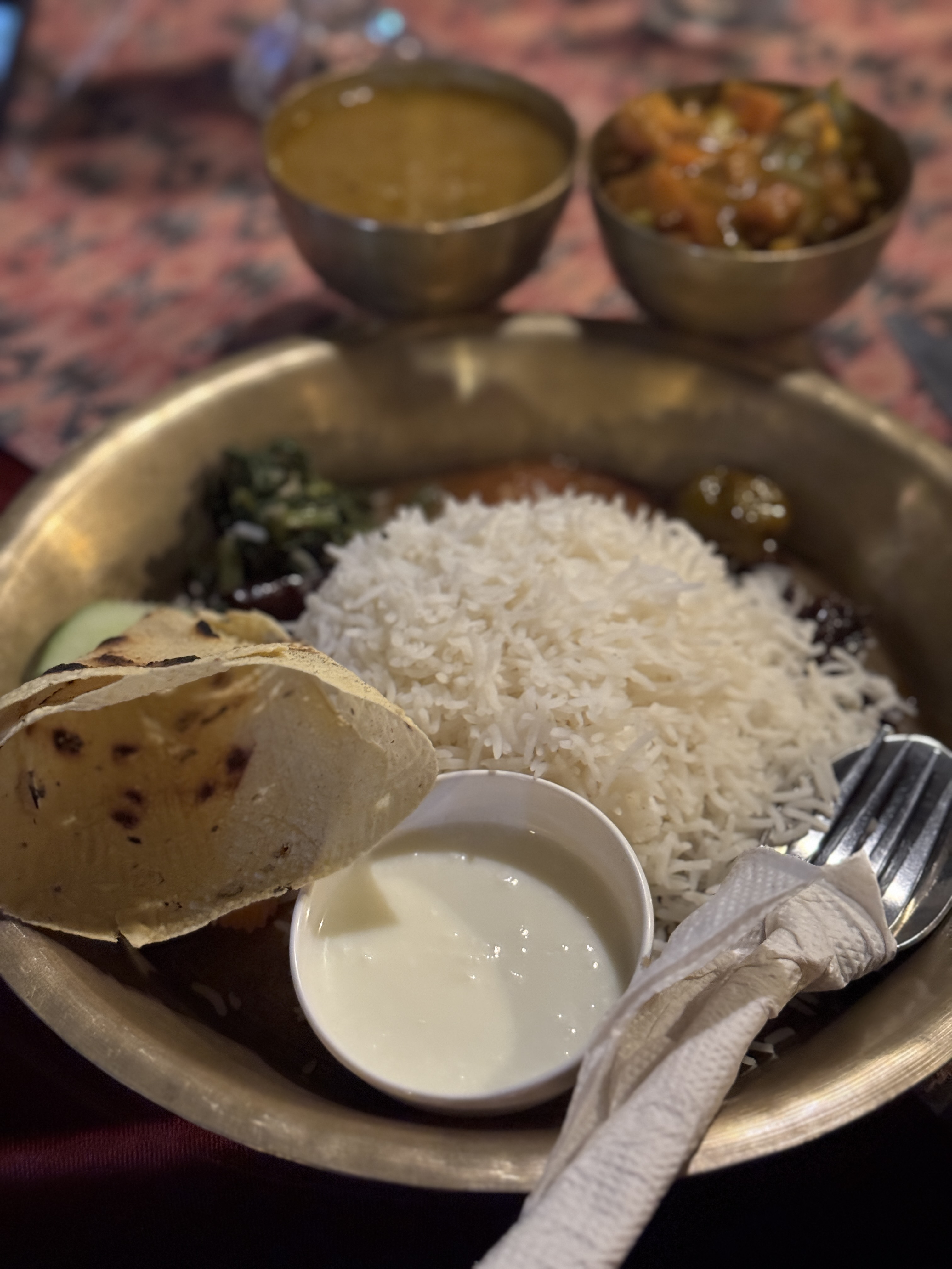 Je me régale avec un Dal Bhat et, en plus, je teste avec la sauce yaourt ! Enfin, un Nepali Thali pour être précise !  Certains à côtés font brûler la bouche mais, encore une fois, tout est est très bon. Localement bon.